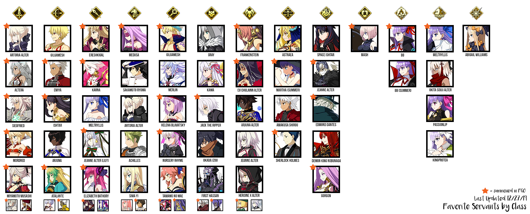 Ahh, summoning servants—the reason this game is so addictive...and maddening. The list below indicates which servants I have summoned. And, because this game is naturally gacha hell, also indicates which servants I really want and would likely whale for when given the chance. :)Not all servants are created equal. Check out my favorite servant chart to see who I love most!